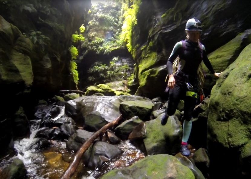Jumps in, balances across logs, swims, scrambles through blockups, walks through wondrous narrows, passings beneath dripping ferns. We kept moving to stay warm, abseiled beside waterfalls into cold swirling water, laughed, marvelled at the grandeur of it all.